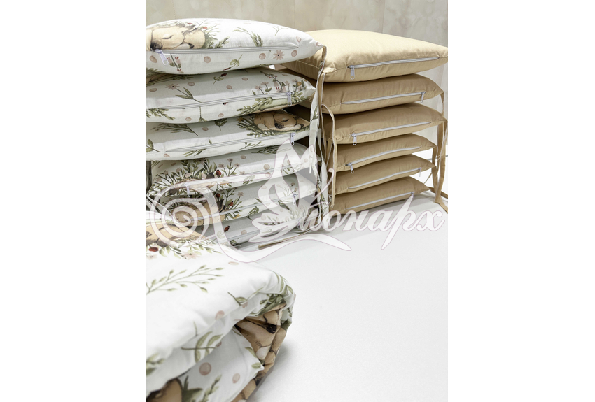 Бортик составной: 12 подушек 31х34 см на замочках упакованы в сумку-переноску.