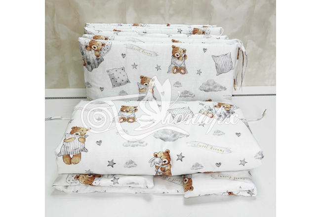 Бортики СО СЪЕМНЫМИ ЧЕХЛАМИ в кроватку: защитят Вашего малыша от ушибов, сквозняков, солнечных лучей и не дадут малышу запутаться в прутьях кроватки. - Простыня на резинке 60х120 см (подходит для стандартной кроватки)